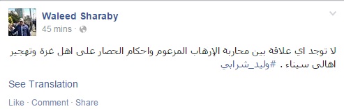 وقال "شرابي" في تدوينة عبر صفحته على موقع التواصل الاجتماعي "فيس بوك": "ﻻ توجد أي علاقة بين محاربة الإرهاب المزعوم، وإحكام الحصار على أهل غزة، وتهجير أهالي سيناء".