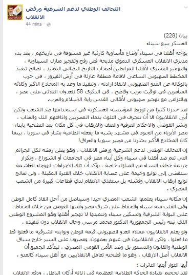 وأعلن التحالف الوطني لدعم الشرعية ورفض الانقلاب، رفضه لكل "الجرائم التي تتم ضد أهلنا في سيناء وكل أبناء مصر في الجامعات أو الشوارع، وتكرار جريمة خطف النساء من المنازل خاصة"، مؤكدًا أن "تلك الإجراءات الهوجاء الغاشمة ستفضي إلى توابع وخيمة على عصابة الانقلاب خلال الفترة المقبلة، ولن تعالج توابع إرهاب الانقلاب وفشله بل ستغذي الانتقام لدي قطاعات كبيرة من الشعب المصري".