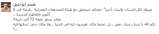 وقال أبو خليل في تدوينة عبر صفحته على موقع التواصل الاجتماعي "فيس بوك": "مبروك لكل الشباب والبنات أخيرا حلمكم حيتحقق مع هيئة المجتمعات العمرانية.. فرصة في 6 أكتوبر والقاهرة الجديدة.. مقابر بسعر لقطة 73 ألف جنيه!!".