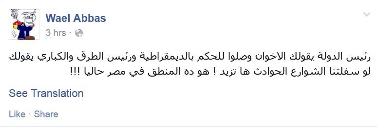 وقال الناشط السياسي، وائل عباس، في تدوينة عبر صفحته على موقع التواصل الاجتماعي "فيس بوك": "رئيس الدولة يقولك الإخوان وصلوا للحكم بالديمقراطية ورئيس الطرق والكباري يقولك لو سفلتنا الشوارع الحوادث ها تزيد! هو ده المنطق في مصر حاليا !!!".
