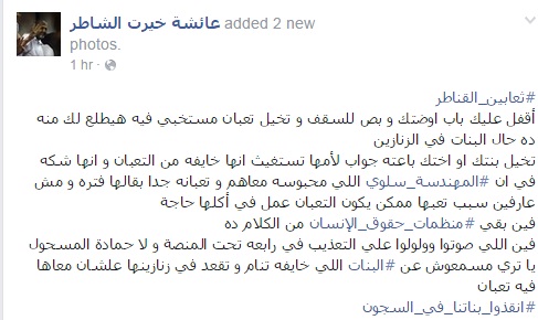 وقالت الشاطر في تدوينة عبر صفحتها الرسمية على موقع التواصل الاجتماعي "فيس بوك": "اقفل عليك باب أوضتك وبص للسقف، وتخيل تعبان مستخبي فيه هيطلع لك منه.. ده حال البنات في الزنازين.. تخيل بنتك أو اختك باعته جواب لأمها تستغيث أنها خايفة من التعبان وأنها شكه في أن المهندسة سلوى اللي محبوسة معاهم وتعبانه جدا بقالها فترة ومش عارفين سبب تعبها ممكن يكون التعبان عمل في أكلها حاجة".