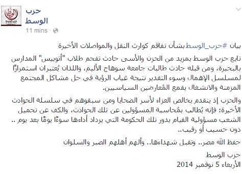 تقدم حزب الوسط بخالص العزاء لأسر ضحايا الحادث، الذي وقع اليوم في محافظة البحيرة، مؤكدًا أن الحادث يأتي استمرارًا لمسلسل الإهمال وسوء التقدير، من قبل حكومة الانقلاب العسكري، وذلك من خلال الانشغال في قمع المعارضين، وترك مشاكل المجتمع المزمنة دون حل.