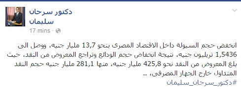 وأضاف سليمان فى تدوينه عبر صفحته الرسمية على موقع التواصل الاجتماعي "فيس بوك "، "انخفض حجم السيولة داخل الاقتصاد المصري بنحو 13,7 مليار جنيه، ووصل الى 1,5436 تريليون جنيه، نتيجة انخفاض حجم الودائع وتراجع المعروض من النقد، حيث بلغ المعروض من النقد نحو 425,8 مليار جنيه، منها 281,1 مليار جنيه حجم النقد المتداول خارج الجهاز المصرفي".