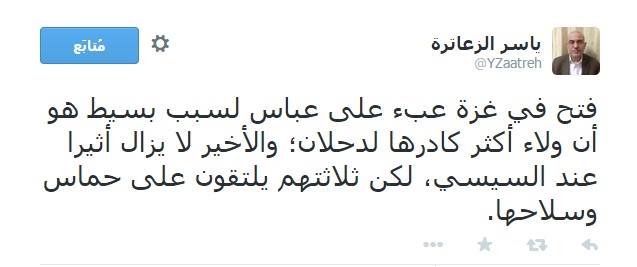 وقال الزعاترة في تغريدة عبر صفحته على موقع التواصل الاجتماعي "تويتر": "فتح في غزة عبء على عباس لسبب بسيط، هو أن ولاء أكثر كادرها لدحلان؛ والأخير لا يزال أثيرًا عند السيسي، لكن ثلاثتهم يلتقون على حماس وسلاحها".