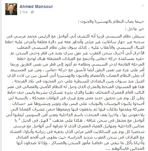 وقال منصور في تدوينة عبر صفحته على موقع التواصل الاجتماعي "فيس بوك": "سيعلن نظام السيسي قريبًا أنه اكتشف أني أتواصل مع الرئيس محمد مرسي في سجن،ه عبر جهاز ساتلايت غير مرئي، وأتحاور معه عبر دائرة مغلقة، وأعرض عليه خطط اغتيال السيسي والانقلاب عليه".
