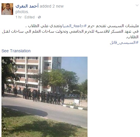 وقال البقري في تدوينه عبر صفحته على موقع التواصل الاجتماعي "فيس بوك": "مليشيات السيسي تقتحم حرم جامعة_المنيا، وتعتدي على الطلاب".