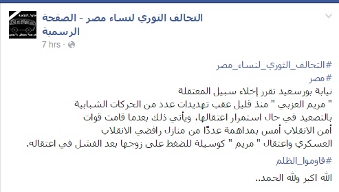 قال التحالف الثورى لنساء مصر إن ﻧﻴﺎﺑﺔ ﺑﻮﺭﺳﻌﻴﺪ قررت ﺇﺧﻼﺀ ﺳﺒﻴﻞ ﺍﻟﻤﻌﺘﻘﻠﺔ " ﻣﺮﻳﻢ ﺍﻟﻌﺰﺑﻲ " فى ساعة متأخرة من مساء أمس الاثنين، ﻋﻘﺐ ﺗﻬﺪﻳﺪﺍﺕ ﻋﺪﺩ ﻣﻦ ﺍﻟﺤﺮﻛﺎﺕ ﺍﻟﺸﺒﺎﺑﻴﺔ ﺑﺎﻟﺘﺼﻌﻴﺪ ﻓﻲ ﺣﺎﻝ ﺍﺳﺘﻤﺮﺍﺭ ﺍﻋﺘﻘﺎﻟﻬﺎ.