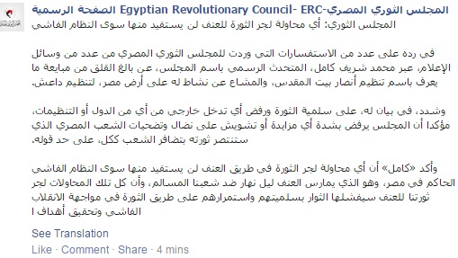 وشدد، في بيان له، نشر عبر الصفحة الرسمية للمجلس على موقع التواصل الاجتماعي "فيس بوك" على "سلمية الثورة ورفض أي تدخل خارجي من أي من الدول أو التنظيمات"، مؤكدا أن المجلس "يرفض بشدة أي مزايدة أو تشويش على نضال وتضحيات الشعب المصري الذي ستنتصر ثورته بتضافر الشعب ككل"، على حد قوله.