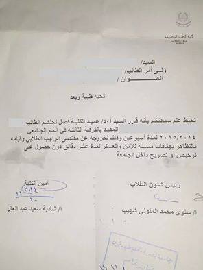 يأتي ذلك بعد أسابيع قليلة من تصريحات رئيس الجامعة الشهيرة التي هدد الطلاب فيها بمنع التظاهر قائلاً: "سلميتكم عند أمكم، هفض أي مظاهرة أو تجمع داخل الجامعة"، وتحولت بعدها الجامعة لثكنة عسكرية لقوات داخلية الانقلاب والجيش، واعتقلت على إثرها قوات أمن الانقلاب طالبتين وعشرات الطلاب من داخل الحرم الجامعي.