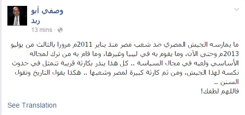 وقال أبوزيد في تدوينه عبر صفحته على موقع التواصل الاجتماعي "فيس بوك": "وما يقوم به في ليبيا وغيرها، وما قام به من ترك لمجاله الأساسي ولعبه في مجال السياسة.. كل هذا ينذر بكارثة قريبة، تتمثل في حدوث نكسة لهذا الجيش، ومن ثم كارثة كبيرة لمصر وشعبها.. هكذا يقول التاريخ وتقول السنن".