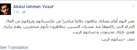 قال الشاعر عبد الرحمن يوسف، أن مصر اليوم أمام "عصابة، يدافعون دفاعًا مباشرًا عن مكتسباتهم، وثرواتهم من المال الحرام، التي راكموها منذ عشرات السنين".