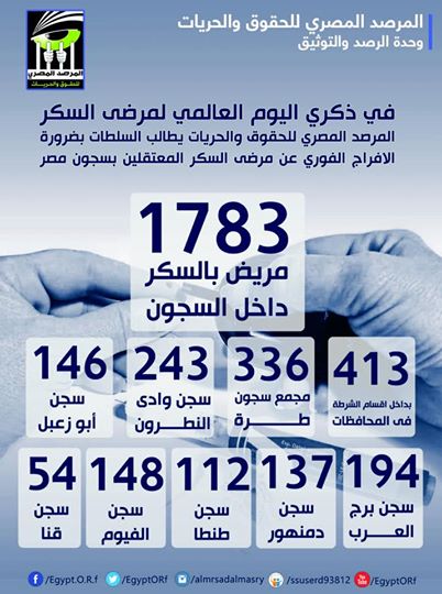 وقال المرصد في بيانه:" أنه من بينهم " 1783 " مريضا بالسكر وفقا لما تم رصده منذ أحداث انقلاب الثالث من يوليو حتى الآن ، حيث تمركزت حالات الإصابة بالمرض فى سجون " مجمع سجون طرة 336 حالة و سجن وادى النطرون 243 حالة و سجن أبوزعبل 146 حالة و سجن برج العرب 194 و سجن دمنهور 137 حالة و سجن طنطا 112 حالة و سجن الفيوم 148 حالة و سجن قنا 54 و 413 حالة على باقى السجون و مقرات الإحتجاز المختلفة".