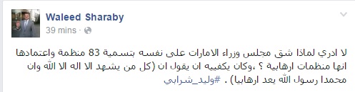 وتساءل شرابي عبر صفحته على موقع التواصل الاجتماعي "فيس بوك": "ﻻ أدري لماذا شق مجلس وزراء الإمارات على نفسه، بتسمية 83 منظمة، واعتمادها أنها منظمات إرهابية؟".