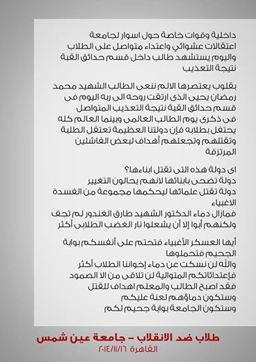 وقالت الحركة في بيانها:" إنه فى ذكرى يوم الطالب العالمى،"وبينما العالم كله يحتفل بطلابه فإن دولتنا العظيمة تعتقل الطلبة وتقتلهم وتجعلهم أهدافا لبعض الفاشلين المرتزقة"، وتساءل:" أى دولة هذه التى تقتل أبناءها لأنهم يحاولون التغيير، دولة تقتل علمائها ليحكمها مجموعة من الفسدة الأغبياء، حسبما قال البيان.