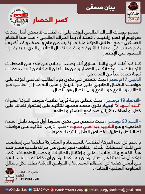 ودعت الحركة كل أبناء الحركة الطلابية للاستعداد و المشاركة بفاعلية في الإنتفاضة في تلك المحطات الثلاثة للتعبير بحق عن حراك طلاب مصر ضد هذا القمع و الإرهاب الأمني و إعتقال الطالبات و حصار الجامعات، مؤكدين على سلميتهم التامة فضلا ًعن سلمية الدفاع عن أنفسهم.