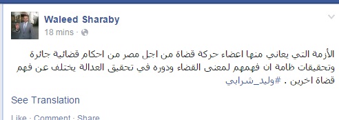وقال شرابي في تدوينة عبر صفحته على موقع التواصل الاجتماعي "فيس بوك": "الأزمة التي يعاني منها أعضاء حركة قضاة من أجل مصر من أحكام قضائية جائرة، وتحقيقات ظالمة، إن فهمهم لمعنى القضاء ودوره في تحقيق العدالة يختلف عن فهم قضاة آخرين".