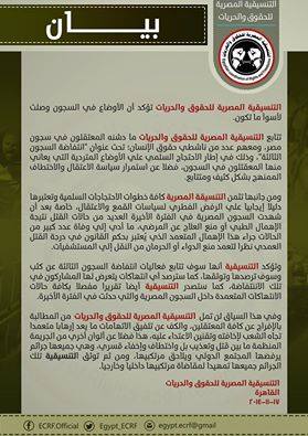 أصدرت "التنسيقية المصرية للحقوق والحريات" بيانًا أكدت فيه على دعمها لانتفاضة السجون التي دعا لها المعتقلون في سجون مصر، ومعهم عدد من ناشطي حقوق الإنسان؛ تحت عنوان "انتفاضة السجون الثالثة"، وذلك في إطار الاحتجاج السلمي على الأوضاع شديدة السوء التي يعاني منها المعتقلون في السجون، فضلاً عن استمرار سياسة الاعتقال والاختطاف الممنهج بشكل كثيف ومتتابع.