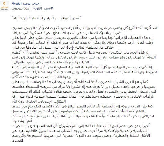 دعا حزب مصر القوية كل القوى الوطنية المصرية المعارضة والمؤيدة إلى إدانة العمليات الجماعات التكفيرية، وإلى التصدي لأفكارها "المتطرفة الشاذة"، وإلى توعية الشباب بمدى خطورة هذه الأفكار.