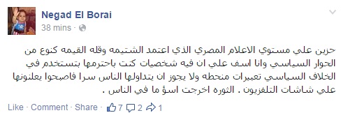 وقال البرعى في تدوينه عبر صفحته على موقع التواصل الاجتماعي "فيس بوك": "أنا أسف على إن فيه شخصيات كنت باحترمها، بتستخدم في الخلاف السياسي تعبيرات منحطة، ولا يجوز أن يتداولها الناس سرًا، فأصحبوا يعلنونها على شاشات التلفزيون"، لافتًا إلى أن "الثورة أخرجت أسوأ ما في الناس".