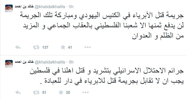 ندد وزير خارجية البحرين، خالد بن أحمد، على حسابه الرسمي بالعملية الاستشهادية التي اسهدفت معبدًا يهوديًا اليوم، وأسفرت عن مقتل 5 صهاينة، إضافة إلى عدد من الجرحى.