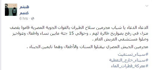 وقال غنيم في تدوينة عبر صفحته على موقع التواصل الاجتماعي "فيس بوك": "الدعاء الدعاء يا شباب، مجرمين سلاح الطيران قاموا بقصف منزل في رفح بصواريخ طائرة لهم، وحوالي 15 جثة ما بين نساء وأطفال وعواجيز وصلوا مستشفى العريش العام".