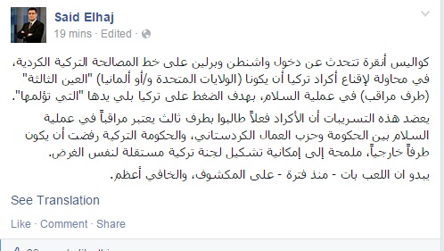 وقال الحاج في تدوينة عبر صفحته على موقع التواصل الاجتماعي "فيس بوك": "كواليس أنقرة تتحدث عن دخول واشنطن وبرلين على خط المصالحة التركية الكردية، في محاولة لإقناع أكراد تركيا أن يكونا (الولايات المتحدة و/أو ألمانيا) "العين الثالثة" (طرف مراقب) في عملية السلام، بهدف الضغط على تركيا بلي يدها التي تؤلمها".