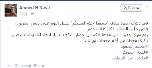 وقال ناصف في تدوينة عبر صفحته على موقع التواصل الاجتماعي "فيس بوك": "في ذكرى صعود هتاف "يسقط حكم العسكر" نكمل اليوم على نفس الطريق، فحي على النضال يا كل طلاب مصر".