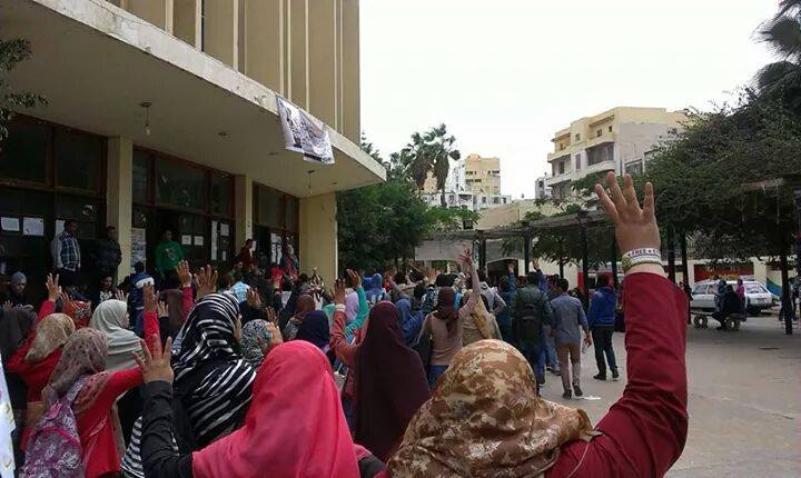 فيما نظم طلاب المجمع الطبي تظاهرة طافت أرجاء المجمع، مرددين هتافات مناهضة للانقلاب العسكري، حملوا خلالها لافتات تندد بالقمع الأمني لإدارة الجامعة، وطالبوا بعودة الطلاب المفصولين إلى دراستهم.
