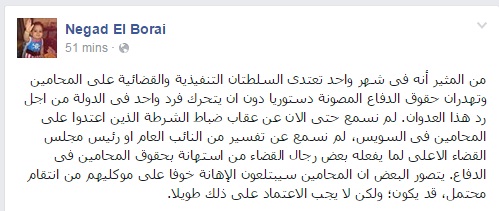 وقال البرعي في تدوينة عبر صفحته على موقع التواصل الاجتماعي "فيس بوك": "من المثير، أنه في شهر واحد تعتدي السلطتان التنفيذية والقضائية على المحامين، وتهدران حقوق الدفاع المصونة دستوريًا، دون ان يتحرك فرد واحد فى الدولة من اجل رد هذا العدوان".