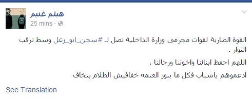وقال غنيم في تدوينة عبر صفحته على موقع التواصل الاجتماعي"فيس بوك": "القوة الضاربة لقوات مجرمي وزارة الداخلية تصل لـسجن_ابو_زعبل وسط ترقب الثوار".