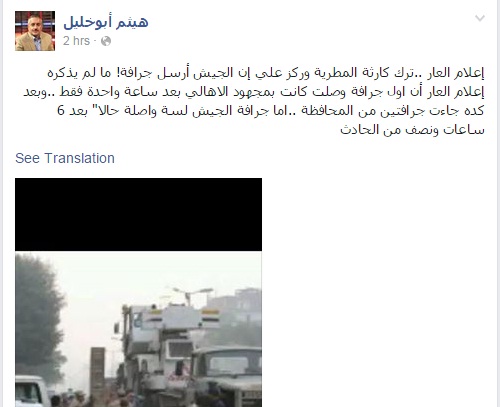 وقال "أبو خليل" في تدوينة عبر صفحته على موقع التواصل الاجتماعي "فيس بوك": "إعلام العار.. ترك كارثة المطرية، وركز على إن الجيش أرسل جرافة! ما لم يذكره إعلام العار أن أول جرافة وصلت كانت بمجهود الأهالي بعد ساعة واحدة فقط.. وبعد كده جاءت جرافتين من المحافظة.. أما جرافة الجيش لسه واصلة حالا بعد 6 ساعات ونصف من الحادث".