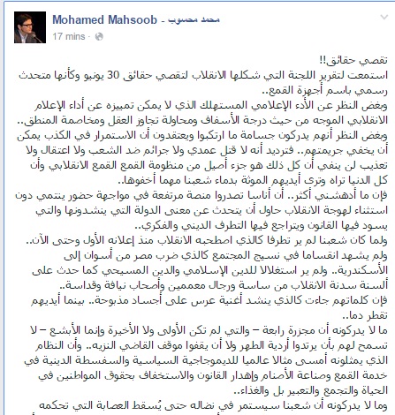 وقال "محسوب" في تدوينة عبر صفحته على موقع التواصل الاجتماعي "فيس بوك": "بغض النظر عن الأداء الإعلامي المستهلك، الذي لا يمكن تمييزه عن أداء الإعلام الانقلابي الموجه، من حيث درجة الإسفاف، ومحاولة تجاوز العقل ومخاصمة المنطق.. وبغض النظر أنهم يدركون جسامة ما ارتكبوا، ويعتقدون أن الاستمرار في الكذب يمكن أن يخفي جريمتهم.. فترديد أنه لا قتل عمدي ولا جرائم ضد الشعب ولا اعتقال ولا تعذيب لن ينفي أن كل ذلك هو جزء أصيل من منظومة القمع الانقلابي، وأن كل الدنيا تراه وترى أيديهم الملوثة بدماء شعبنا مهما أخفوها".