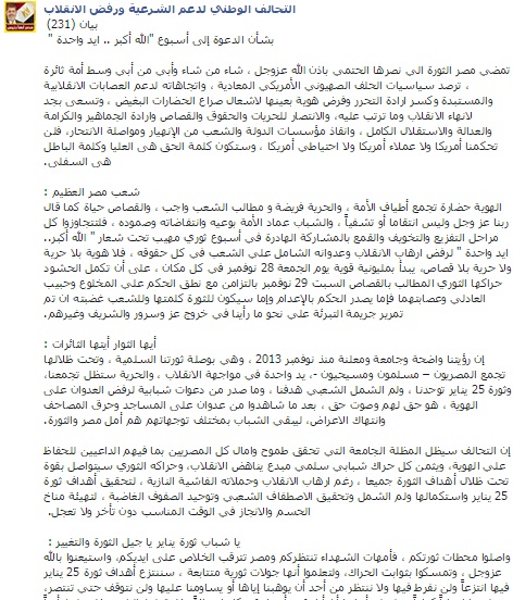 دعا التحالف الوطني لدعم الشرعية ورفض الانقلاب، الشعب المصري، إلى أسبوع ثوري جديد، حمل عنوان "الله أكبر.. ايد واحدة " لمواصلة التظاهر لرفض إرهاب العسكر، وعدوانه الشامل على الشعب المصري في كل حقوقه.