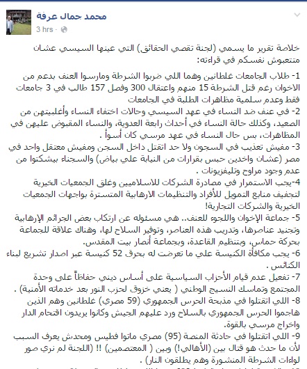 وقال عرفة في تدوينة عبر صفحته على موقع التواصل الاجتماعي "فيس بوك": "خلاصة تقرير ما يسمي (لجنة تقصي الحقائق)، التي عينها المشير عبد الفتاح السيسي، قائد الانقلاب العسكري، عشان متتعبوش نفسكم في قراءته".