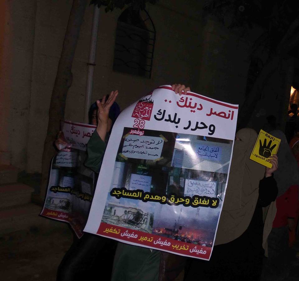 ردد المشاركون هتافات داعية للمشاركة في تظاهرات 28 نوفمبر القادم، في "انتفاضة الشباب المسلم"، كما حمل المشاركون صورًا للرئيس محمد مرسي، مطالبين بعودته، كما حملوا شارات رابعة، وأعلام مصر.