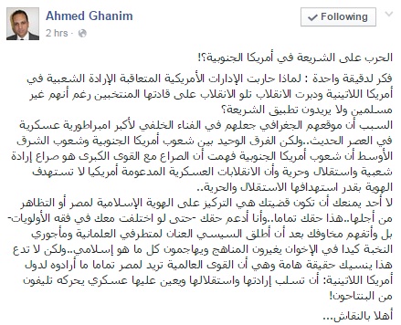 وقال "غانم" في تدوينة، عبر صفحته على موقع التواصل الاجتماعي "فيس بوك": "فكر لدقيقة واحدة: لماذا حاربت الإدارات الأمريكية المتعاقبة، الإرادة الشعبية في أمريكا اللاتينية، ودبرت الانقلاب تلو الانقلاب على قادتها المنتخبين، رغم أنهم غير مسلمين، ولا يريدون تطبيق الشريعة؟".