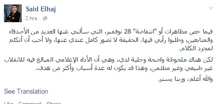 وقال الحاج في تدوينة، عبر صفحته على موقع التواصل الاجتماعي "فيس بوك": "فيما خص مظاهرات أو "انتفاضة" 28 نوفمبر، التي سألني عنها العديد من الأصدقاء والمتابعين، وطلبوا رأيي فيها. الحقيقة لا تصور كامل عندي عنها، ولا أحب أن أتكلم لمجرد الكلام".