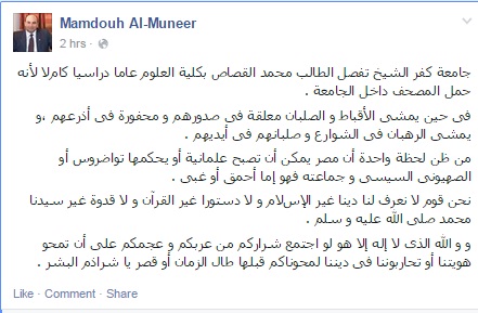 وقال المنير في تدوينة عبر صفحته على موقع التواصل الاجتماعى "فيس بوك": "جامعة كفر الشيخ تفصل الطالب محمد القصاص بكلية العلوم، عامًا دراسيًا كاملًا ﻷنه حمل المصحف داخل الجامعة"، مشيرًا "في حين يمشي اﻷقباط والصلبان معلقة في صدورهم، ومحفورة في أذرعهم، ويمشى الرهبان في الشوارع، وصلبانهم في أيديهم".