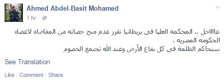 علق الدكتور أحمد عبد الباسط، المتحدث باسم حركة جامعات مستقلة، في تدوينة عبر صفحته على موقع التواصل الاجتماعي "فيس بوك"، على قرار المحكمة العليا في بريطانيا بعدم منح حصانة من المقاضاة، لأعضاء الحكومة المصرية بقوله: "سنحاكم الظلمة في كل بقاع الأرض، وعند الله تجتمع الخصوم".