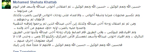 وقال "خطاب" في تدوينة عبر صفحته على موقع التواصل الاجتماعي "فيس بوك": "تم اعتقال أخوتي عبدالله، وأسعد فجر اليوم من منزلهما، وتم تكسير محتويات منزلنا وشقة أخواتي، والاعتداء على زوجات اخواتي الإثنين بالضرب، وكذلك الأطفال لم يرحموهم.. ومن ثم تم اعتقال زوجة أخي عبدالله، وكذلك إبن أخي عبدالله، الذين لم يرحموا إعاقته الذهنية، واعتدوا عليه بالضرب لأنه حاول منعهم من أخذ والده".