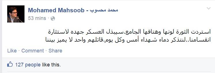 وقال محسوب في تدوينة عبر صفحته على موقع التواصل الاجتماعي "فيس بوك": "استردت الثورة لونها وهتافها الجامع.. سيبذل العسكر جهده لاستثارة انقسامنا.. لنتذكر دماء شهداء أمس وكل يوم.. قاتلهم واحد لا يميز بيننا".