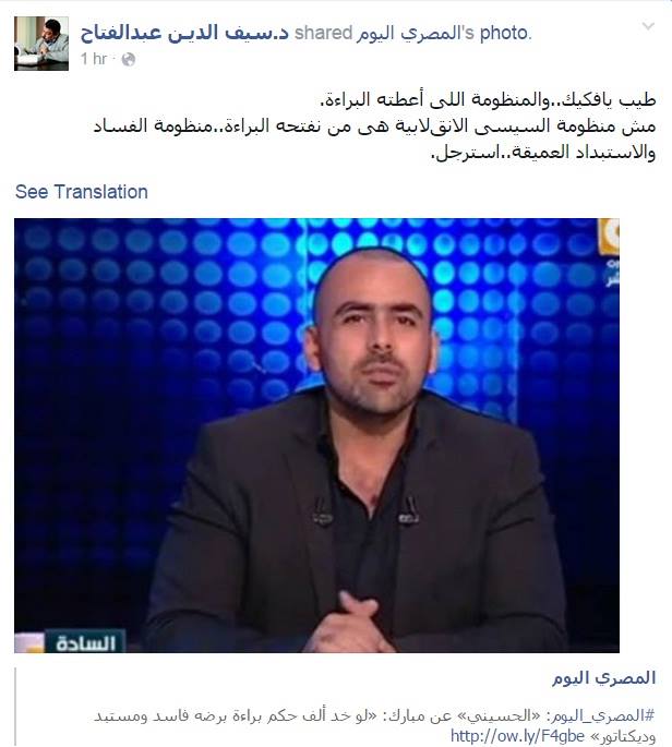 سخر الدكتور سيف الدين عبدالفتاح، أستاذ العلوم السياسية بجامعة القاهرة، من تصريحات الإعلامي يوسف الحسيني، حول الحكم ببراءة المخلوع مبارك قائلًا: "طيب يا فكيك.. والمنظومة اللي أعطته البراءة".