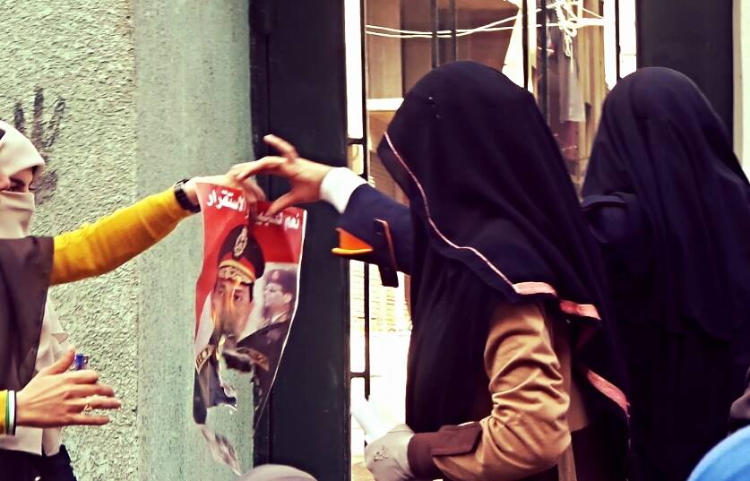 وبعدها تجمعت الطالبات أمام البوابة الرئيسة، كما قمن بإشعال النيران في صور قائد الانقلاب السيسي، مرددين هتافات: "سيسي سيسي يا كلب مبارك …الإعدام في انتظارك"، هذا وقد استمرت المظاهرة لمدة ساعتين، وبعد انتهاء الفعالية تواجد عدد من قوات أمن الانقلاب حول أسوار الكلية.