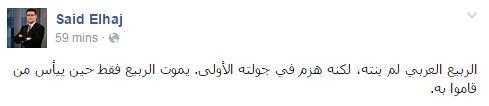 وأضاف الحاج، في تدوينة له على موقع التواصل الاجتماعي "فيس بوك": "الربيع العربي لم ينته، لكنه هزم في جولته الأولى. يموت الربيع فقط حين ييأس من قاموا به".
