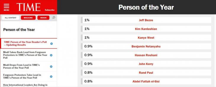 وفقاً للمؤشرات الأولية التي نشرت على الموقع الاليكتروني للمجلة على الانترنت اليوم الأحد أن رئيس الوزراء الهندي ناريندرا مودي تبوأ صدارة الاستفتاء بنسبة 16.2% ، ثم جاء متظاهرو ضاحية فيرجسون الأمريكية التي شهدت مقتل شاب أسود أعزل على يد ضابط شرطة في المركز الثاني بنسبة 9,2 %.