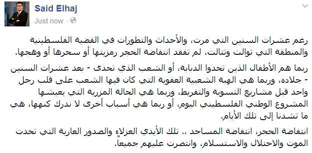 واختتم الحاج تدوينته: "انتفاضة الحجر، انتفاضة المساجد.. تلك الأيدي العزلاء والصدور العارية التي تحدت الموت والاحتلال والاستسلام، وانتصرت عليهم جميعًا".