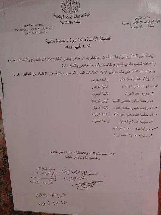 قررت إدارة كلية الدراسات الإسلامية جامعة الأزهر فرع الإسكندرية، تحويل 9 طالبات للتحقيق معهن، ومنعهن من دخول الحرم الجامعى لحين انتهاء التحقيقات.
