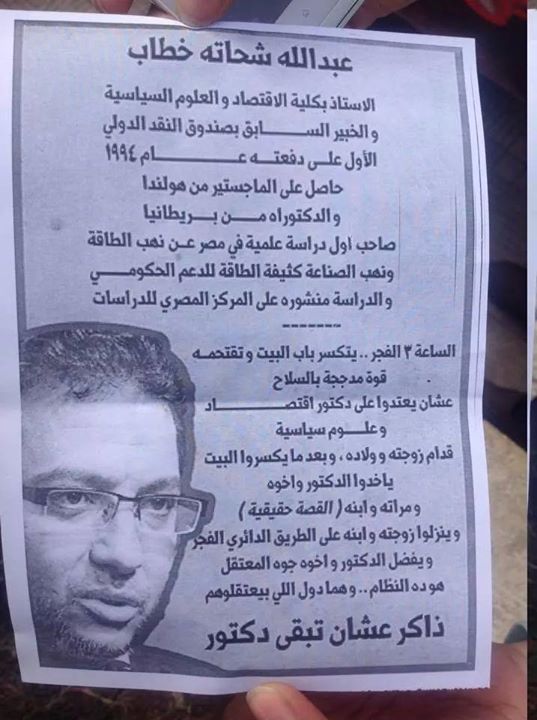 تحت شعار" ذاكر عشان تبقى دكتور" كتب طلاب جامعة القاهرة اليوم رسالة تضامنًا مع الأستاذ بكلية الاقتصاد والعلوم السياسية والخبير السابق بصندوق النقد الدولي، الدكتور عبد الله شحاتة، المعتقل بسجون الانقلاب.