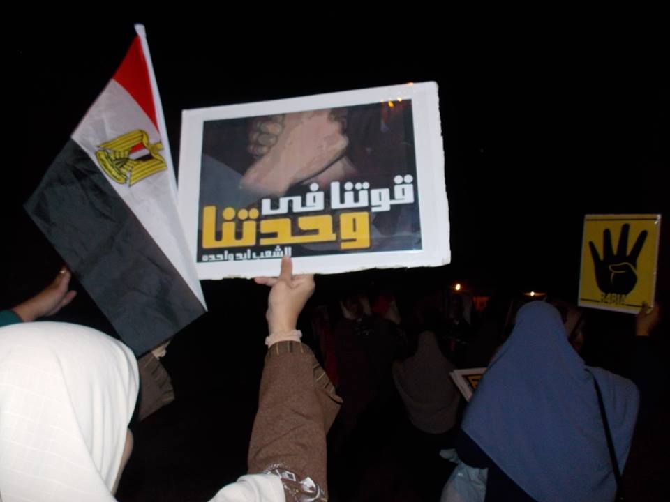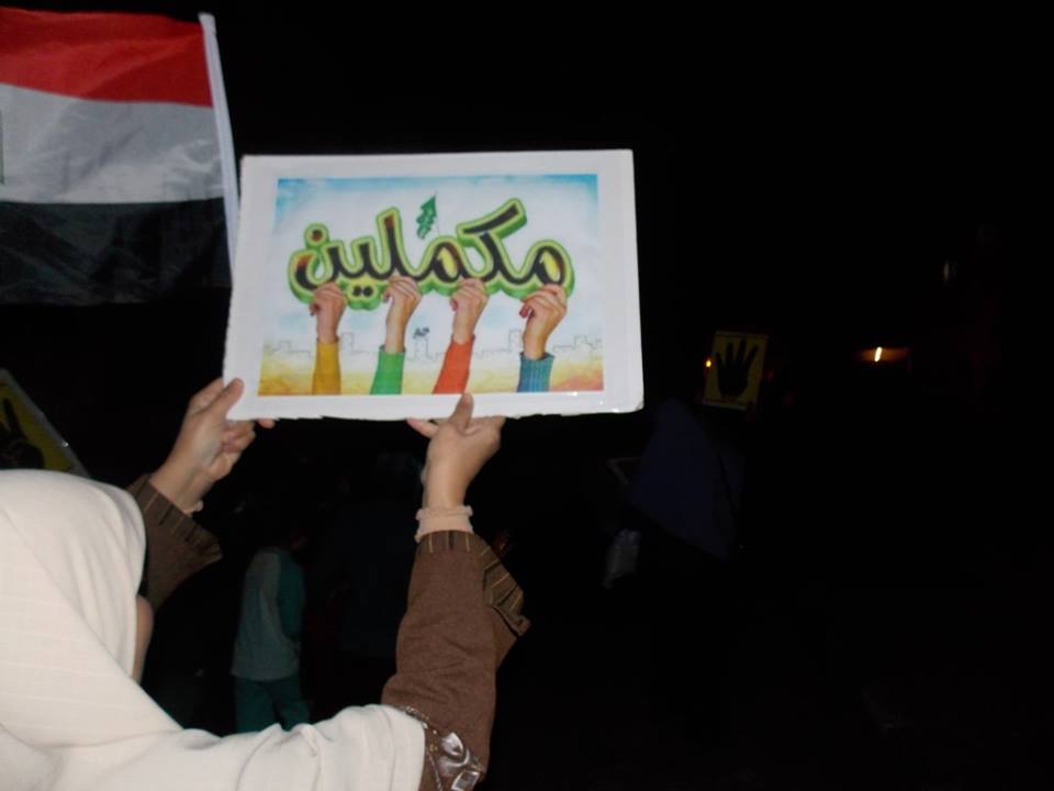 حمل المشاركون لافتات كُتب عليها: "قوم يامصري الظلم"، "مكملين"، "قوتنا في وحدتنا"، كما حملوا شارات رابعة، وأعلام  مصر، وكذلك صورًا للرئيس محمد مرسي، مطالبين بعودته.