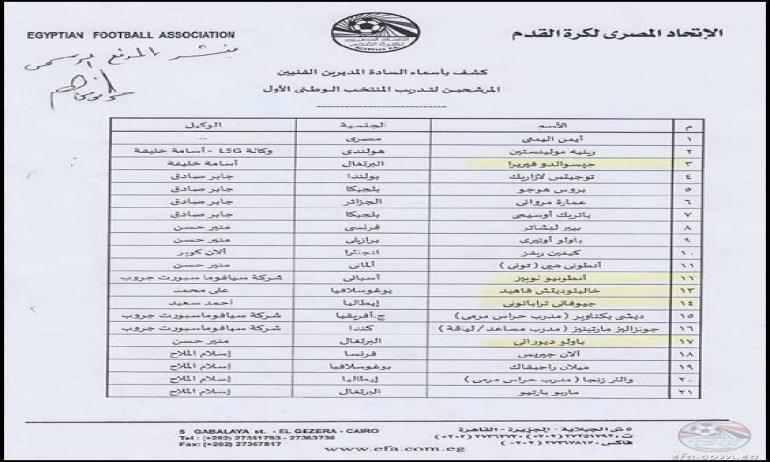 أعلن الاتحاد المصري لكرة القدم عن 21 مدربًا لاختيار أحدهم لتولى مهمة تدريب المنتخب المصري، حيث جاء من بينهم الإيطالي "والتر زينغا" الذى يعد من أبرز المرشحين لتولي المهمة خلفًا للمدرب المُقال شوقي "غريب".